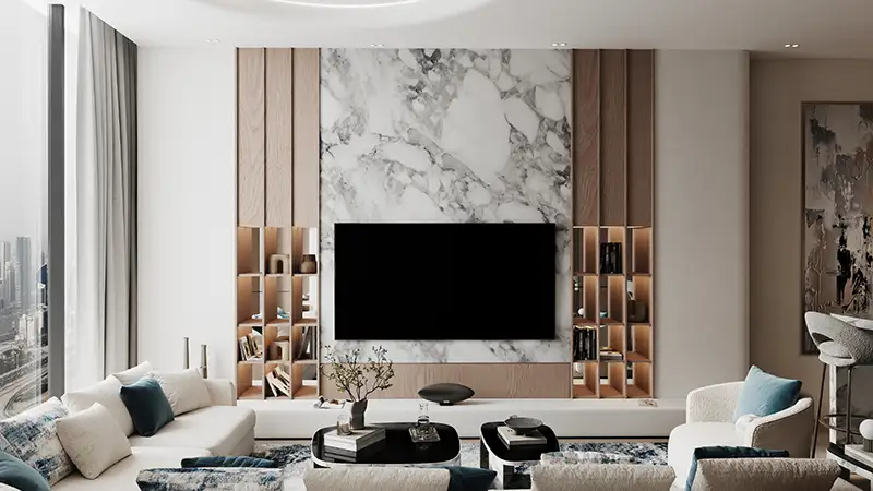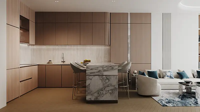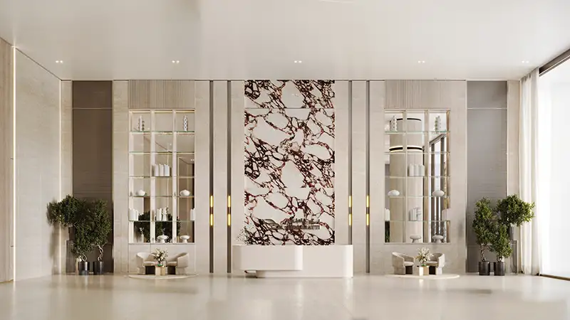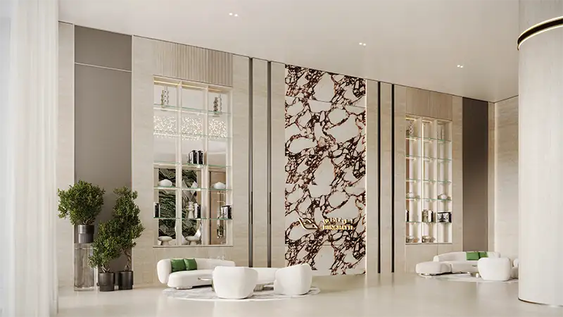 Luxury Interiors, crafted with premium materials such as marble, travertine, oak wood, and antique brass to create an elegant and timeless appeal.