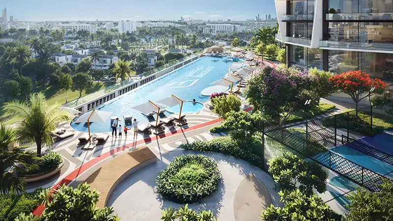 World-class leisure facilities, including a swimming pool, paddle court, basketball court, jogging track, indoor gym, and cabanas for relaxation.