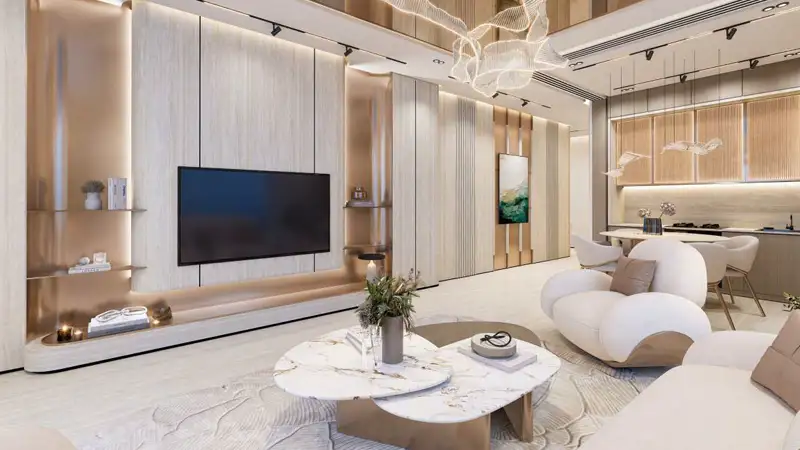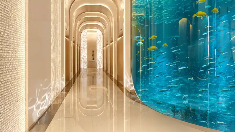 Architecturally, this is the tower in its concept of panorama, where every day is refreshed. The design focuses on uninterrupted 360-degree sea vistas – a stacking of living platforms and terraces that make every elevation a viewpoint for sunrise and sunset. The public areas of the tower are purposely theatrical: a large lobby that greets residents with an aquarium, atrium with a waterfall that mimics the movement of tides and its ornately finished lifting lobbies aimed at establishing the ampacity for the home within. The relationship of the building to the promenade actuates its base, and so the ground plane becomes a series of landscaped walkways, cafes and free leisure spaces, that blurs the indoor/outdoor life. This architecture is not just a matter of form but sequence – entrance, transition and arrival – such that every moment from street to apartment is curated and calm.