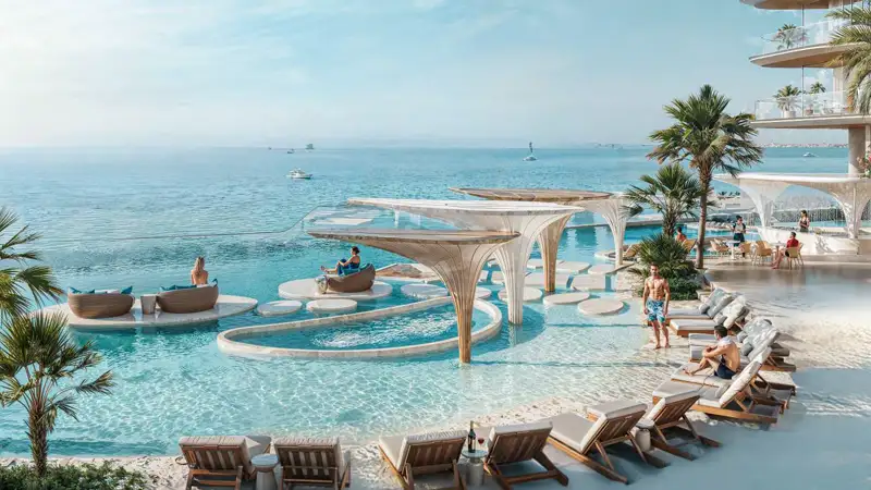 Breez by Danube Properties arrives as a quiet, confident statement of coastal luxury at Dubai Maritime City, where the city exhales and the sea speaks with studios to 4-bedroom apartments and duplex villas. This is not just a high-rise, 60 storey tower that reads like an ode to light, movement and horizon, but a new statement that address the next big move. Imagine waking to uninterrupted blue that envelops your home in a sweepshot and stepping out onto an ocean side promenade that quite literally touches the tower, and moving through communal spaces intended to feel more like a five-star resort than an apartment building. The development off the blues on waterfront reinterprets waterfront living – complete furnished residences with ocean/bay/sea views. The low-density maritime enclave is where architecture, landscapes and leisure choreograph time, speed of life upgrade daily living. It is a project balanced in theatrical gestures – a 1,500 sq. ft. aquarium anchors the grand lobby, a waterfall atrium inspired by the rhythm of the ocean and quietly intelligent residential design; so your days at home could be both cinematic and effortlessly pragmatic, just as a waterfront home ought to be.